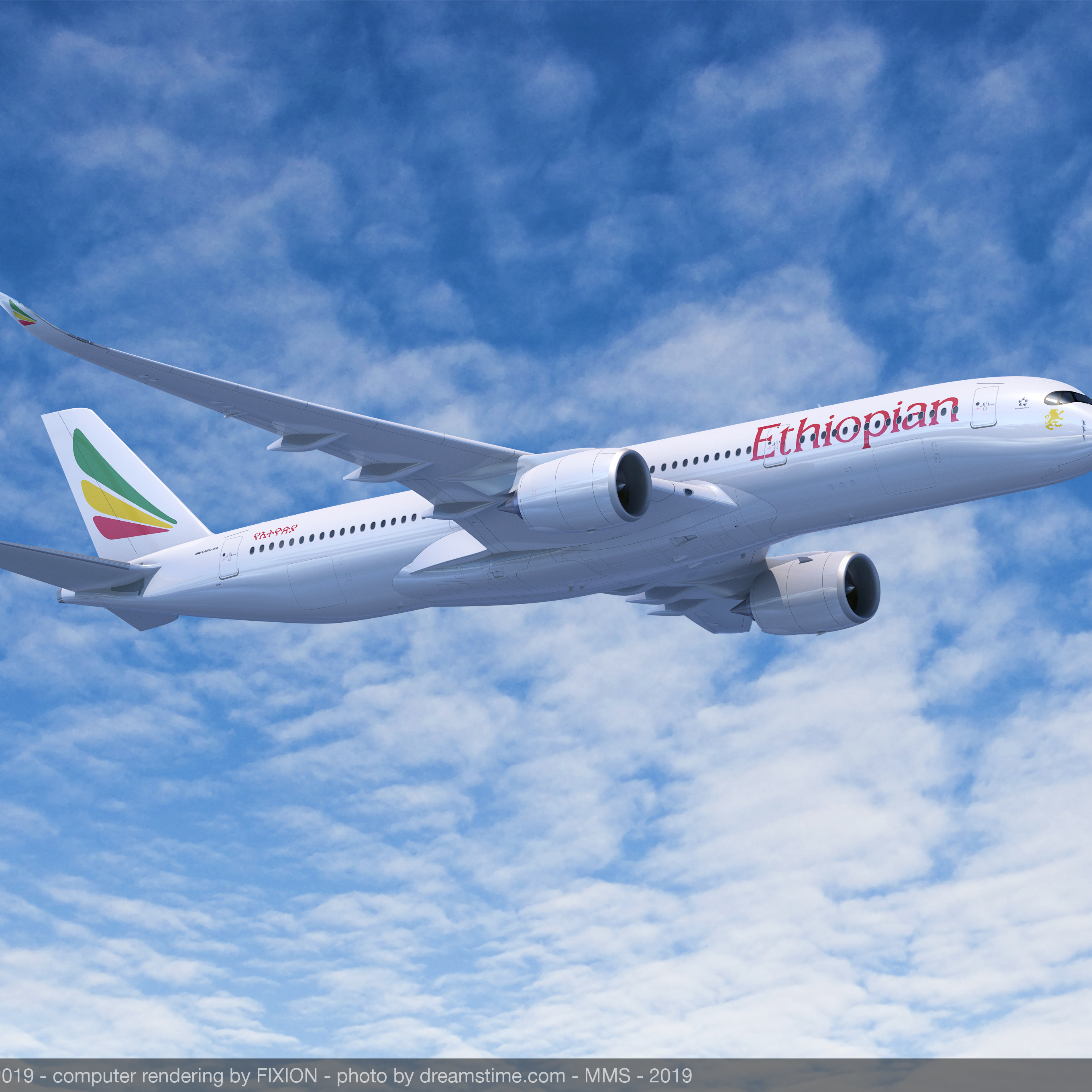 Avion Airbus A350-900 d'Ethiopian Airlines en vol dans un ciel bleu avec nuages, rendu 3D par Airbus.