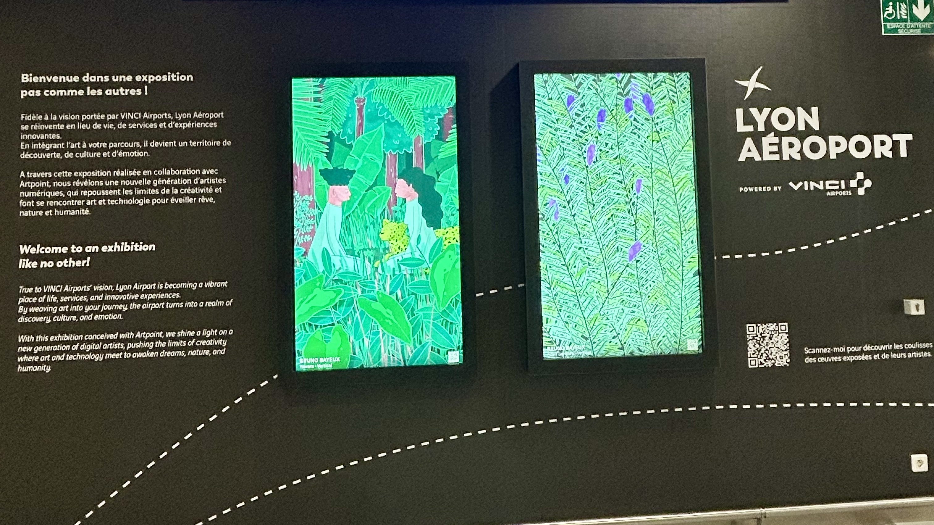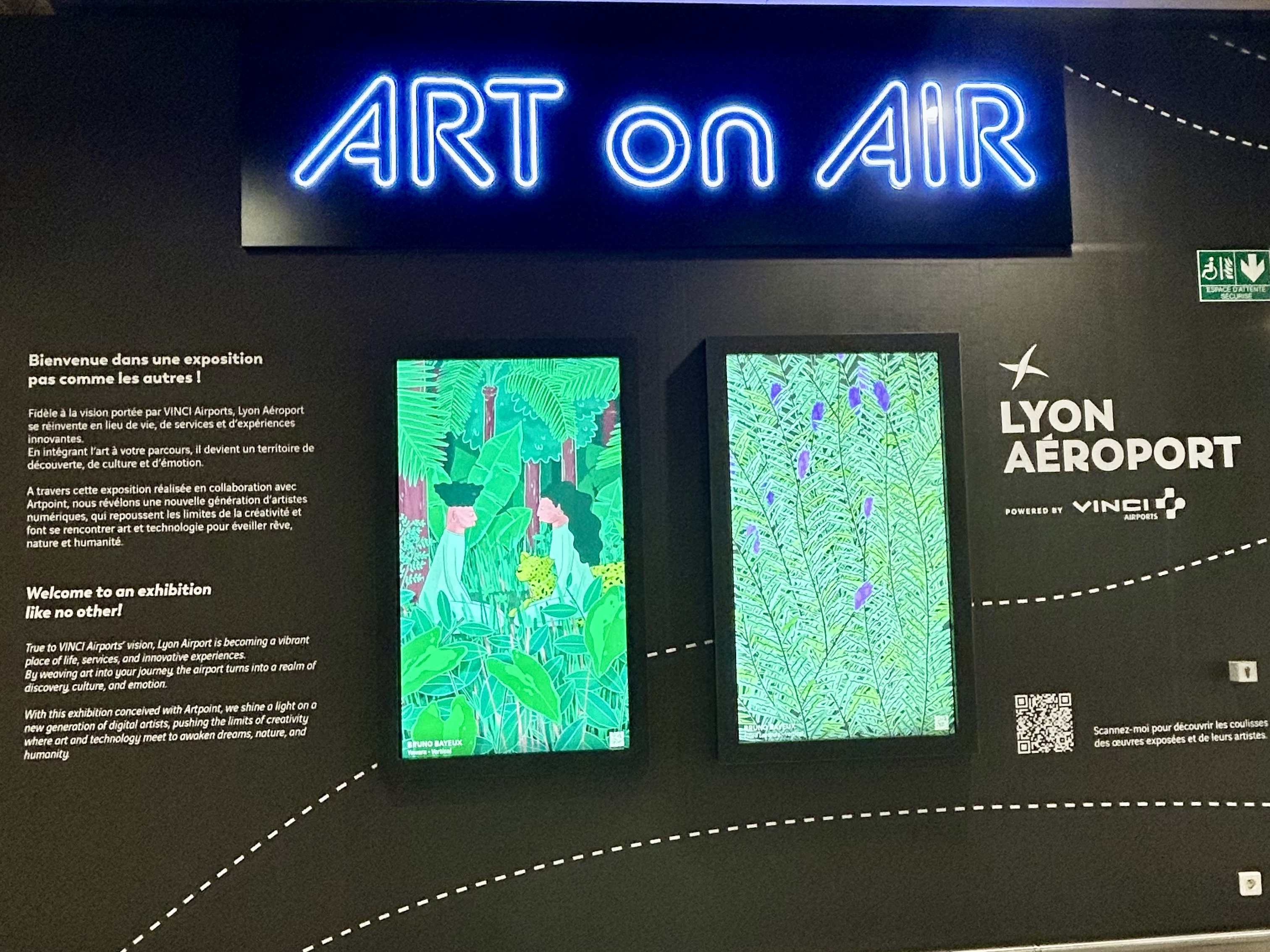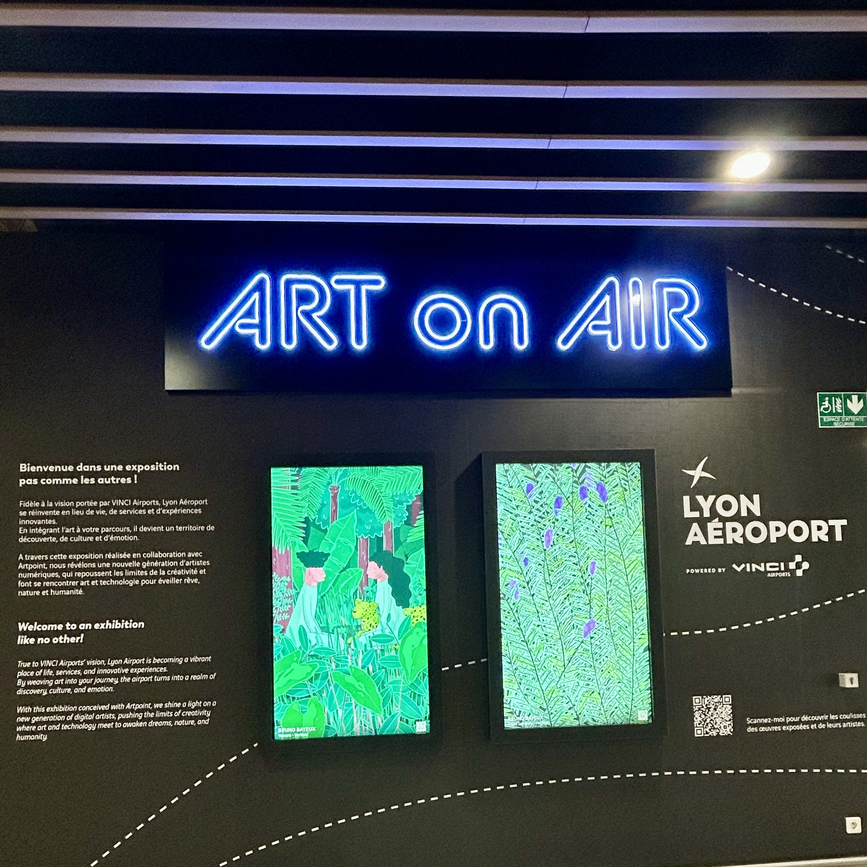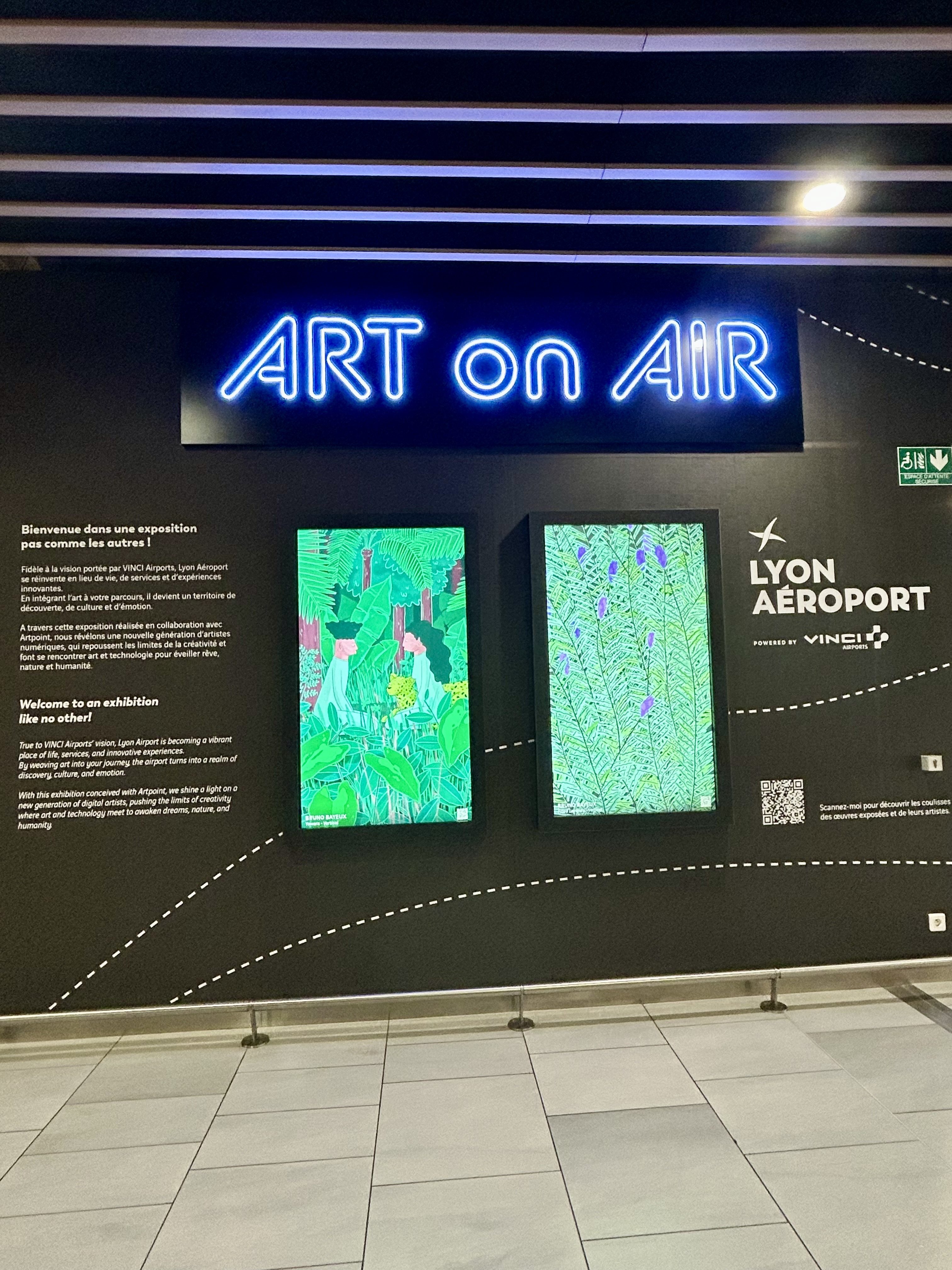 Espace Art on Air à l’aéroport Lyon-Saint Exupéry présentant des œuvres d’art numérique visibles dans le terminal.