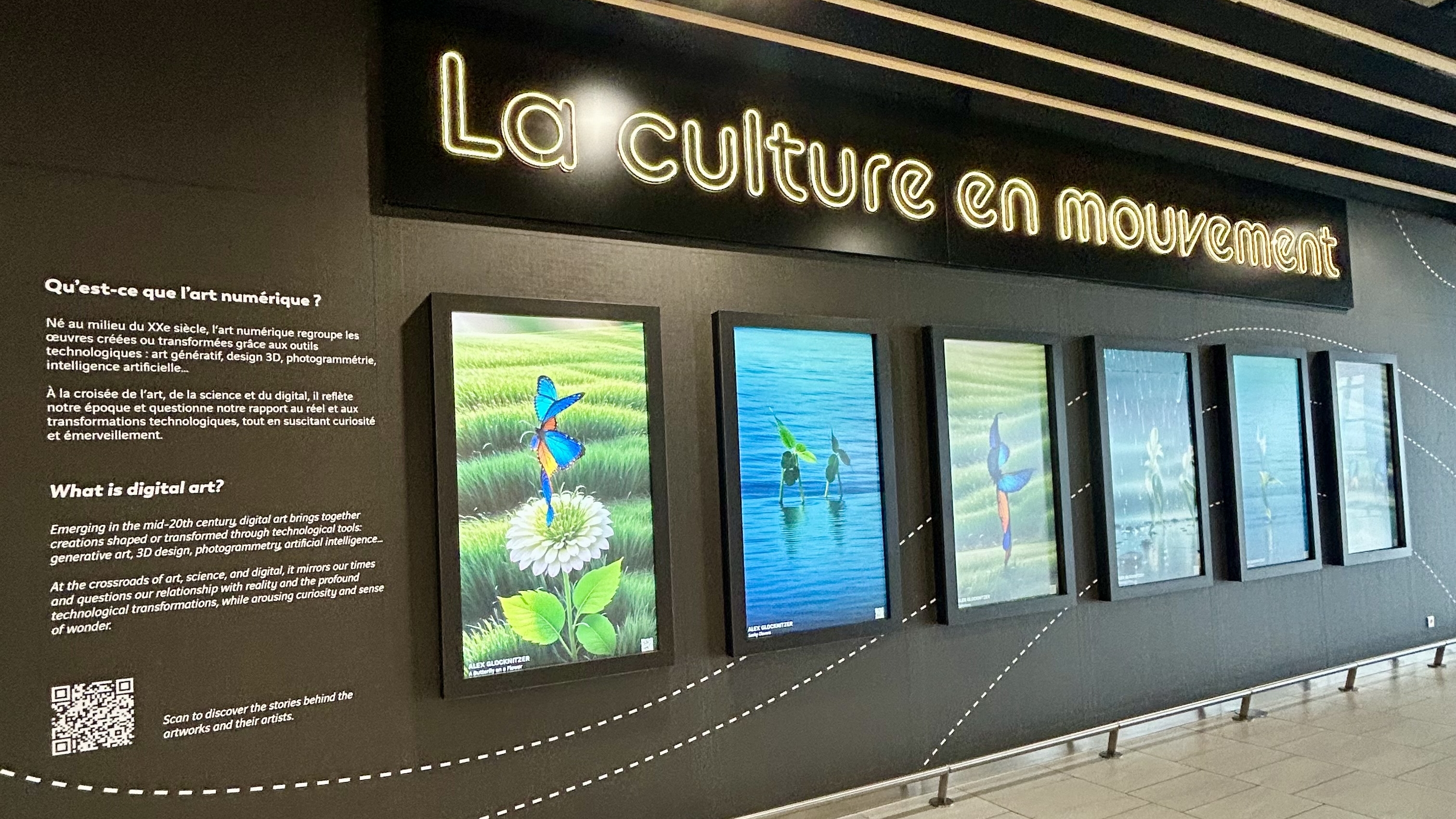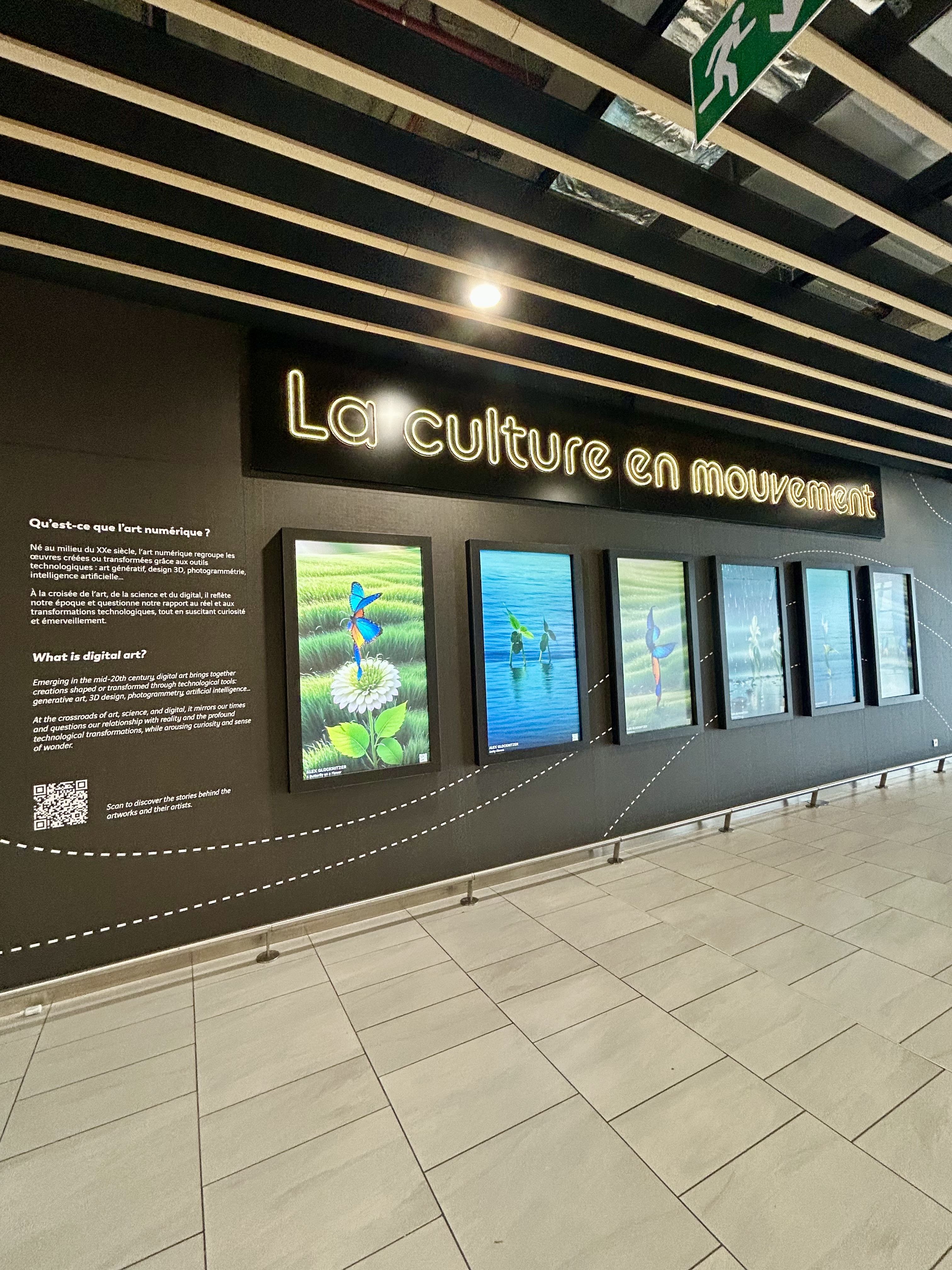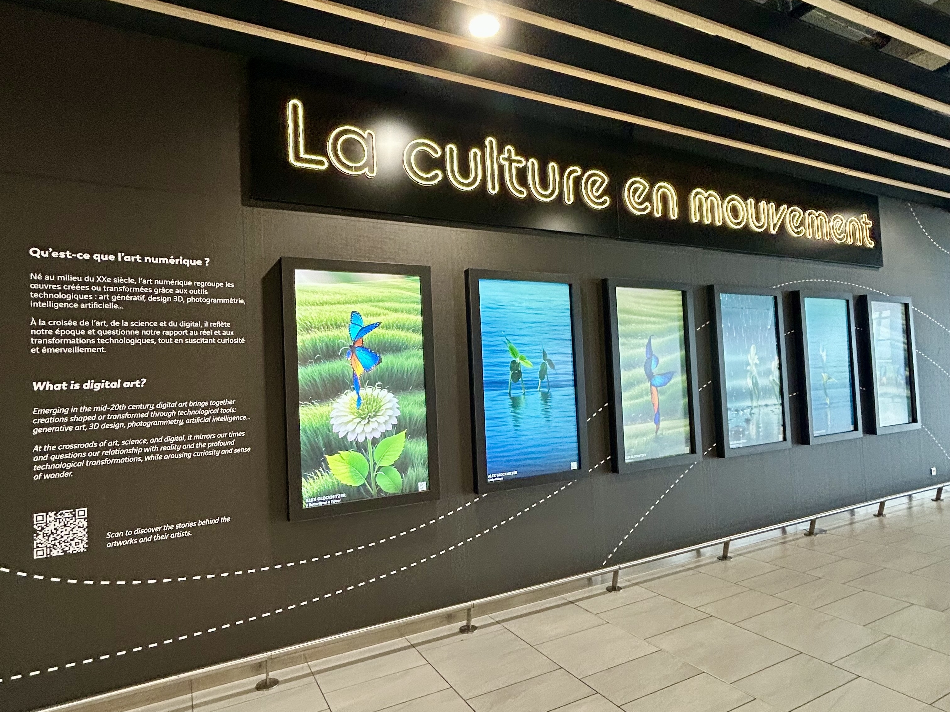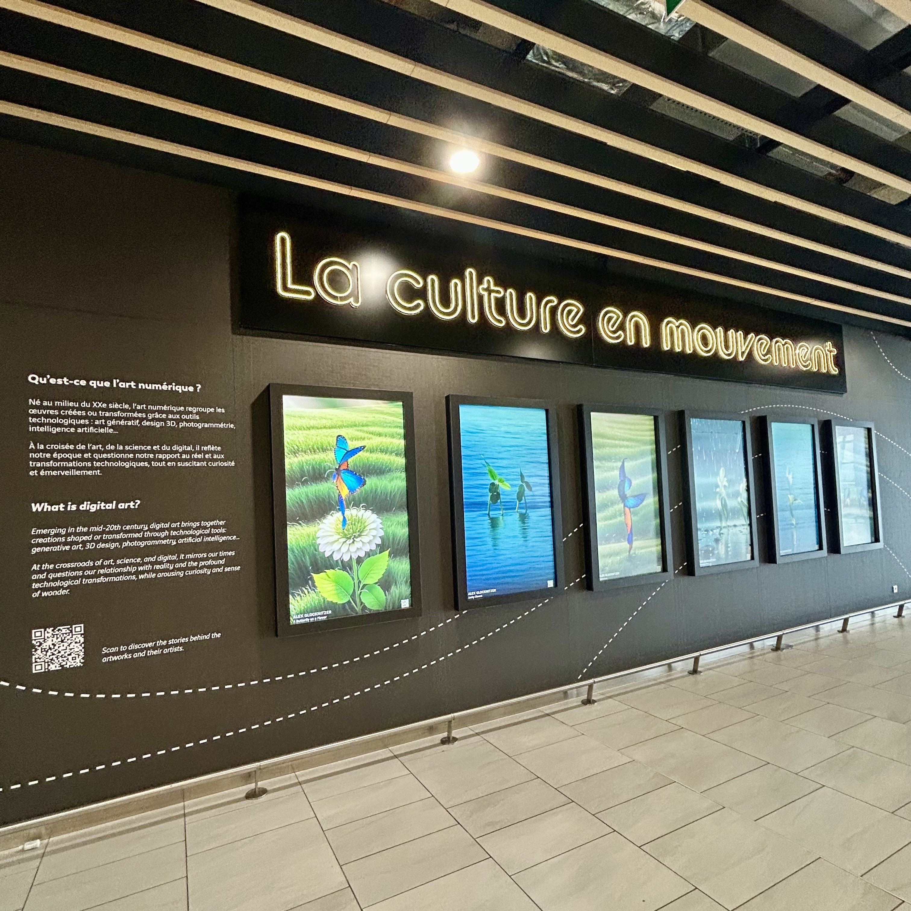 Mur d’exposition Art on Air présentant des œuvres d’art numérique sous l’enseigne « La culture en mouvement » à l’aéroport Lyon-Saint Exupéry.