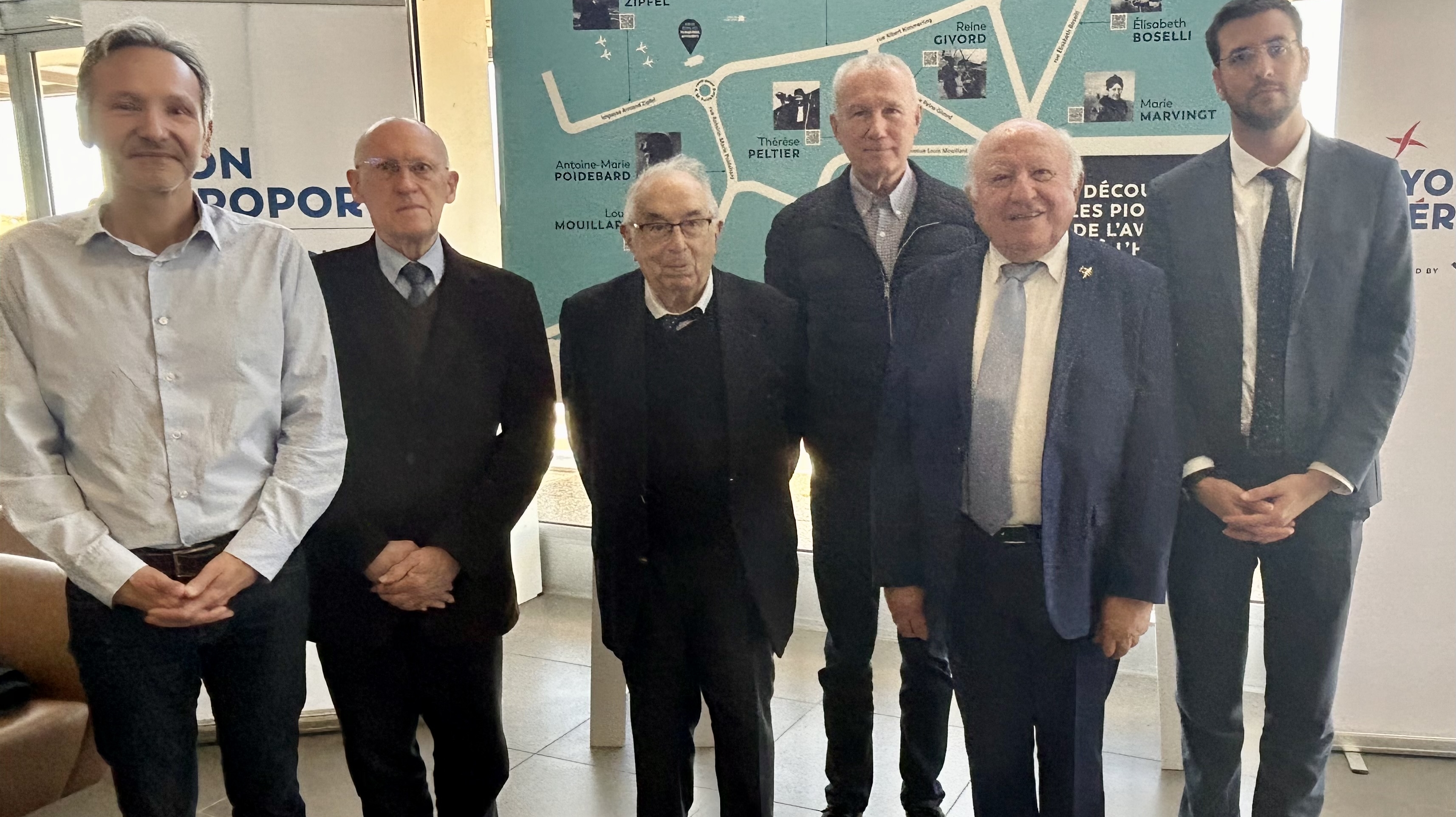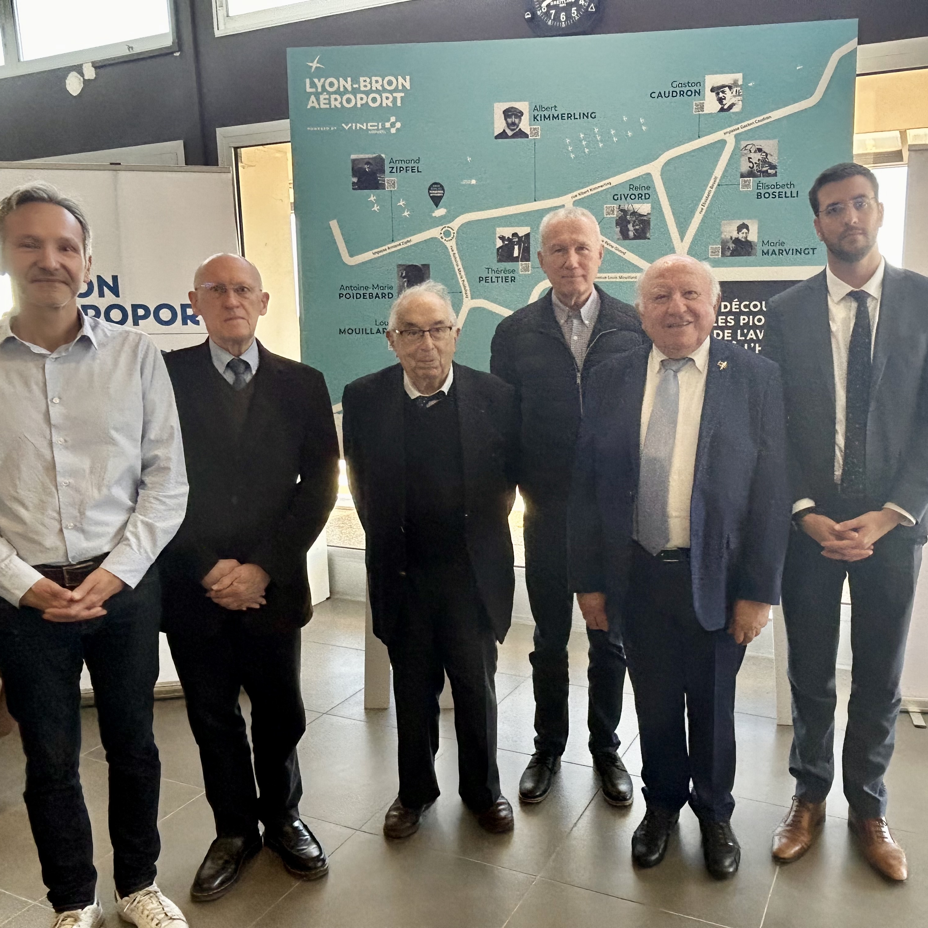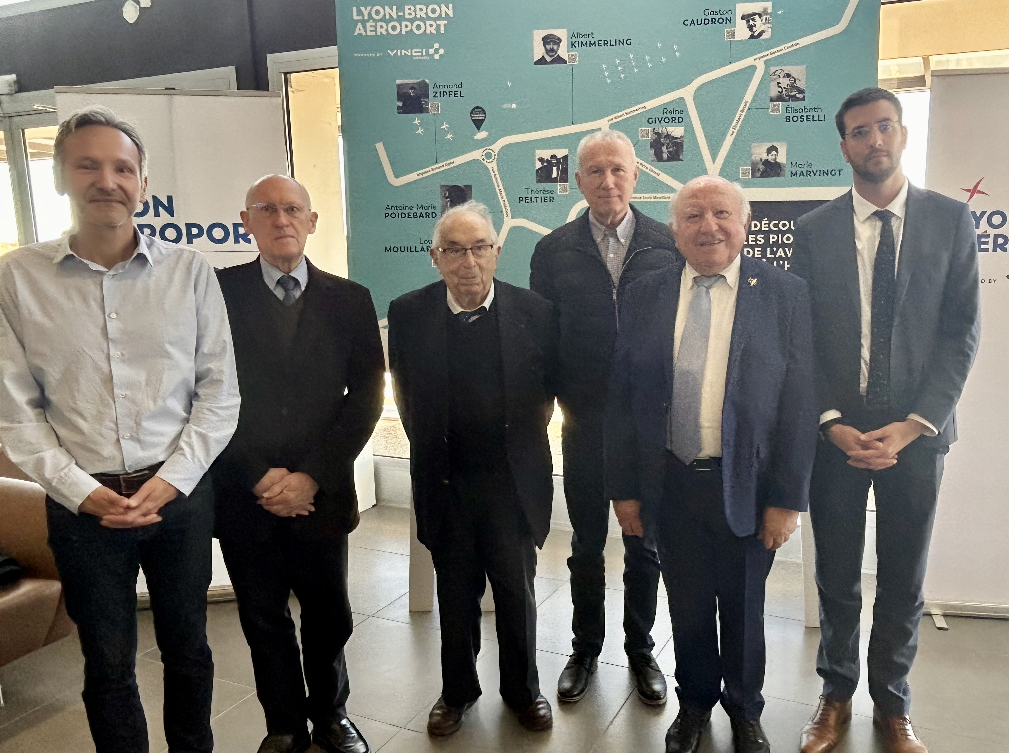 Lionel Lassagne Directeur Développement durable et Immobilier d'Aéroports de Lyon et Cyrille Boulnois, Directeur de l'Aéroport Lyon-Bron encadre les historiens de SLADHA Monsieur Treillet ancien directeur d’exploitation de l’aéroport, Monsieur Mathevet Historien de l’aéronautique et la SLADHA – Société Lyonnaise d’Histoire de l’Aviation et de Documentation Aéronautique.