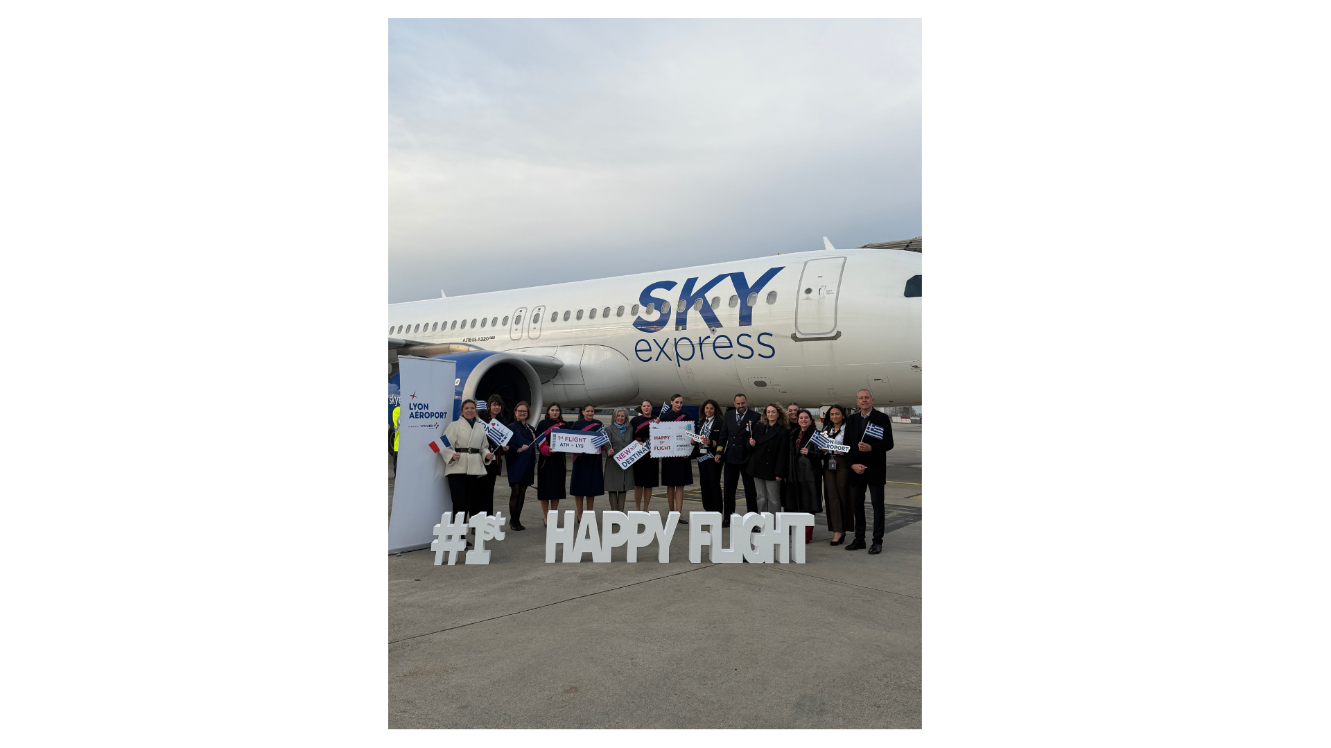 Avion Sky Express devant lequel des représentants posent avec pancarte # Happy Flight à l'aéroport Lyon-Saint Exupéry.