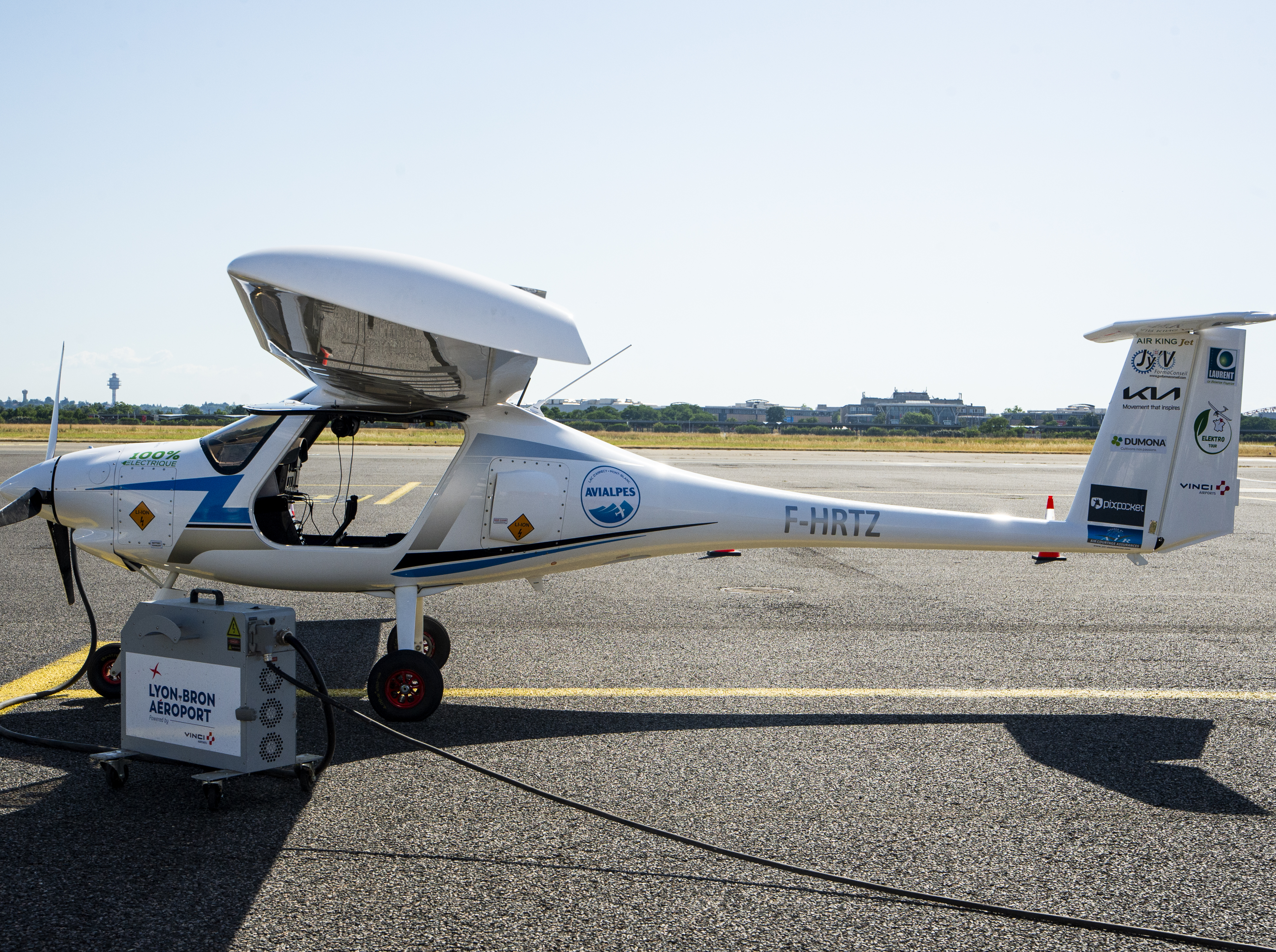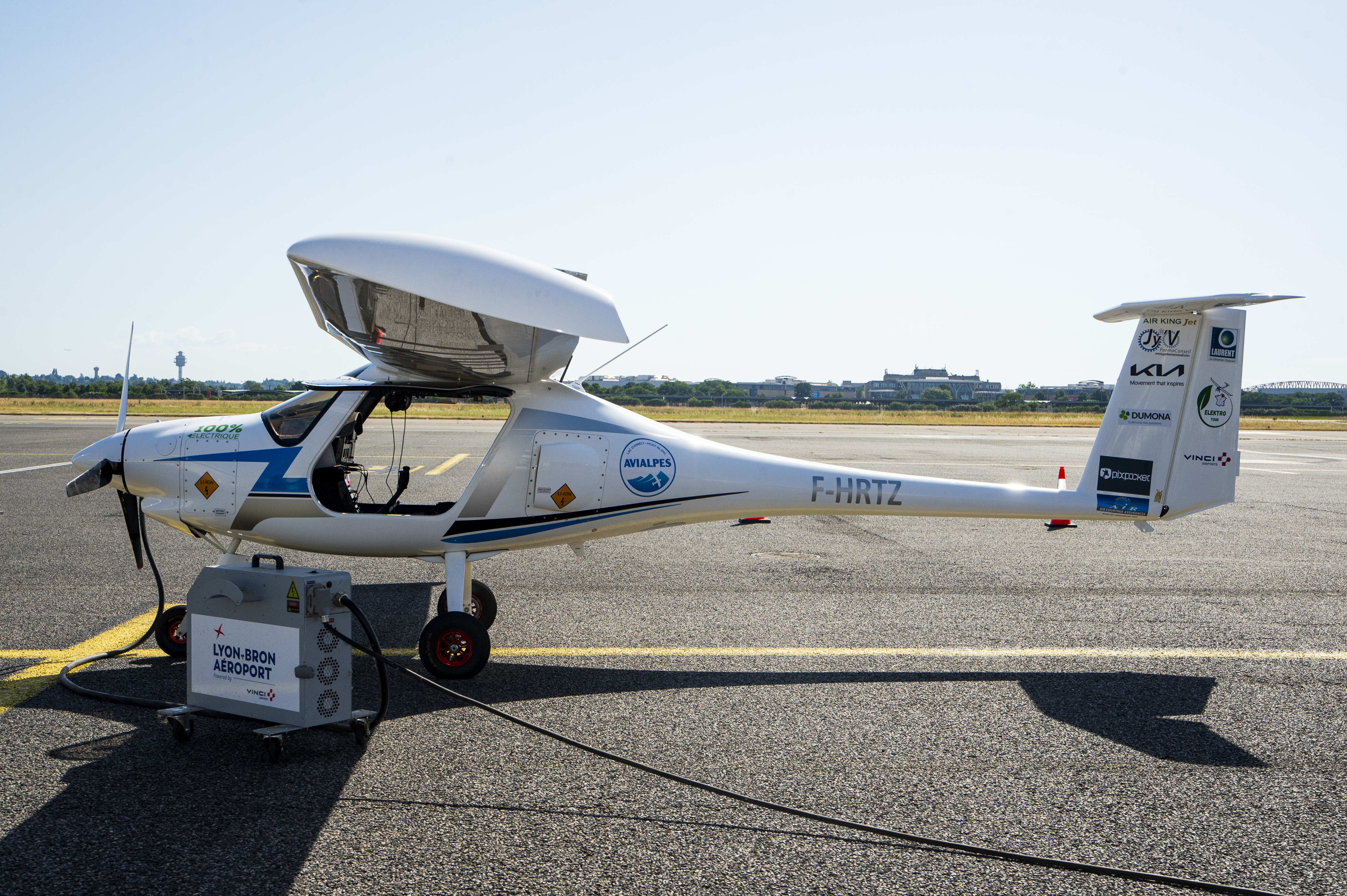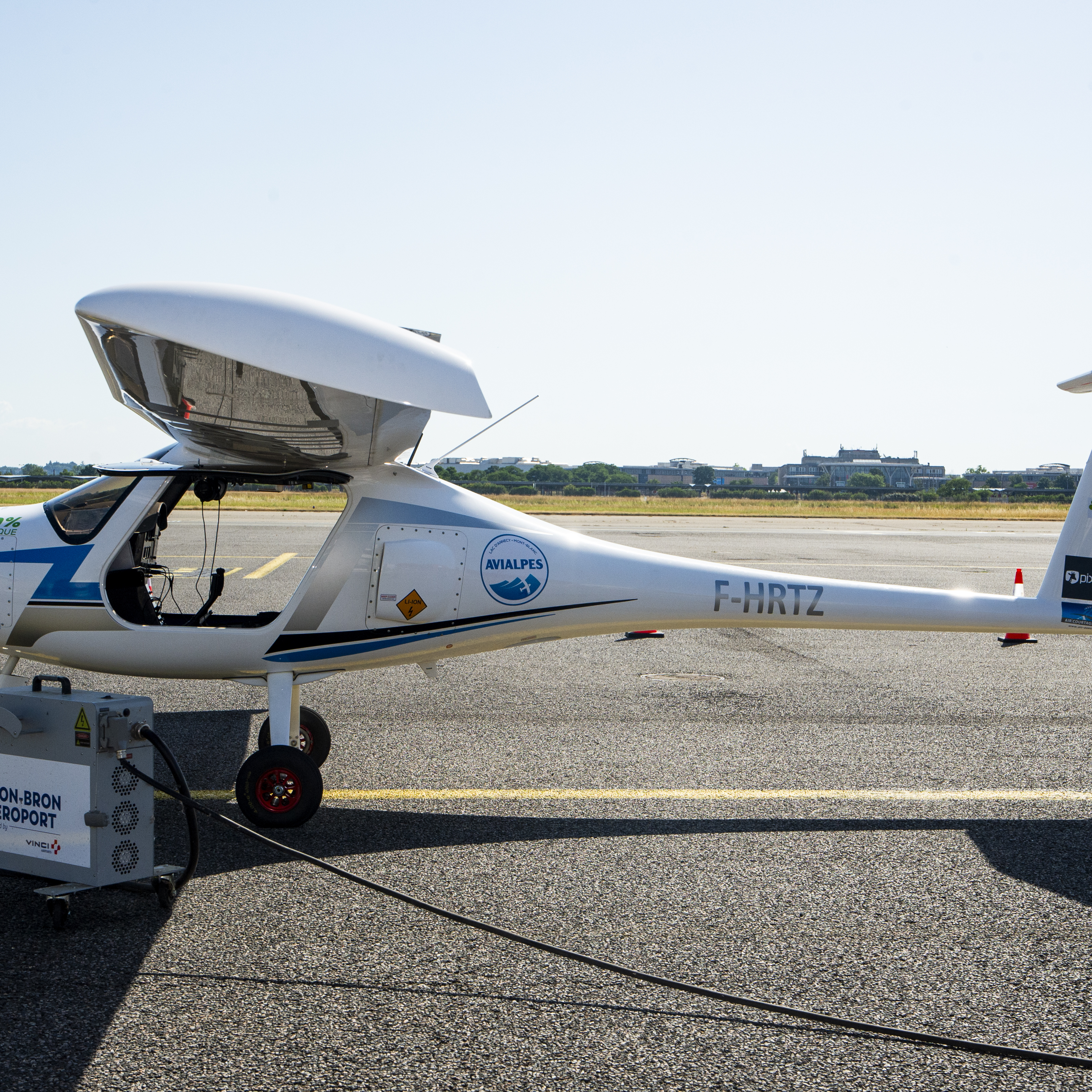 Avion électrique Pipistrel Velis Electro en cours de recharge sur le tarmac de l’aéroport Lyon-Bron, dans le cadre de l’Elektro Tour soutenu par VINCI Airports.